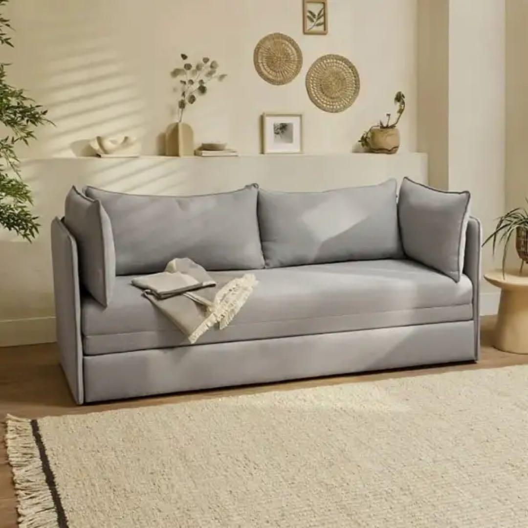 - 息子の一人暮らしの部屋用に買ってやりました。 私も現物を確認しましたが、ソファーにすると狭い部屋にくつろぎの空間が生まれます。座った時の生地の肌触りもGoodです。ベッド時は、腰掛部分と背もたれ部分の硬さが異なるために、しっかりめの敷布団を敷いた方が良いと思います。そうすれば寝心地も良いでしょう。